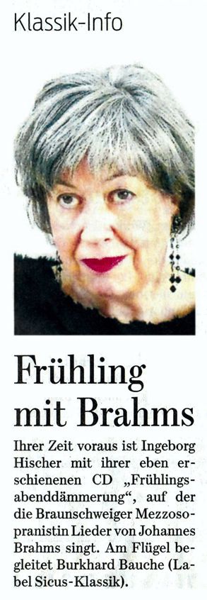 08. 01. 2017 [...] ich möchte mich ganz herzlich bedanken für die „Frühlingsabenddämmerung“. Ich [...] hatte meine helle Freude daran. [...] In einer Komplettausgabe seiner Werke, die ich habe, nehmen die Lieder nicht weniger als 11 von 59 CDs ein. Ich kenne sie natürlich bei weitem nicht alle, auf Ihrer CD kannte ich immerhin etwa die Hälfte. Sie gefallen mir besser als ihre Pendants in der o. a. Ausgabe [...]. 03. 01. 2017 [...] Die CD habe ich in einem Stück genossen; die stimmliche und pianistische Ausgestaltung der Lieder ist ganz hervorragend, der Umfang der Stimme hat mich beeindruckt und das Anhören mir große Freude geschenkt. Auch die Anordnung der Lieder und die Aufnahme fand ich sehr gelungen. Also, noch einmal eine Verbeugung vor den beteiligten Interpreten, Tontechnikern und dem Verleger! 30. 12. 2016 (Braunschweiger Zeitung) Frühling mit Brahms Ihrer Zeit voraus ist Ingeborg Hischer mit ihrer eben erschienenen CD „Frühlingsabenddämmerung“, auf der die Braunschweiger Mezzosopranistin Lieder von Johannes Brahms singt. Am Flügel begleitet Burkhard Bauche. 29. 12. 2016 [...] Das Programm der CD ist sehr überzeugend und stimmig; die Stimme besitzt wie auch auf der Winterreise-CD einen warmen, dunklen Ton, der den Liedern sehr entgegenkommt. Insgesamt eine Interpretation, die mich sehr anspricht. |